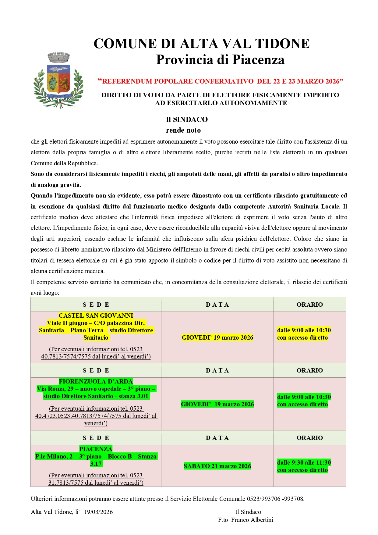 Si allega avviso inerente l'organizzazione del servizio di rilascio delle certificazioni per il voto assistito degli elettori fisicamente impediti.