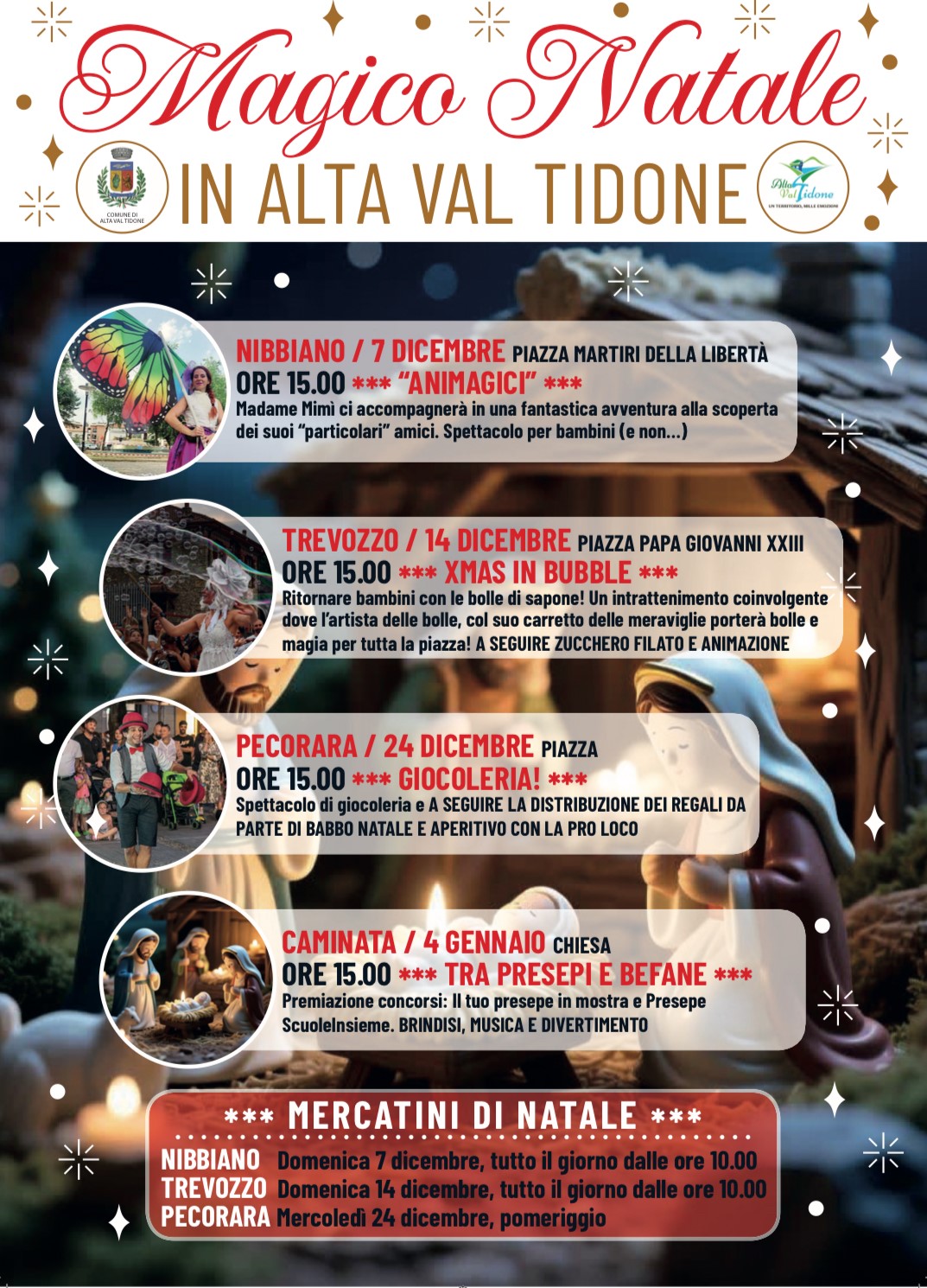 Si accende domenica 7 dicembre a Nibbiano la magia del Natale in Alta Val Tidone che accompagnerà residenti e visitatori con un ricco calendario di appuntamenti dedicati ai più piccoli, ma non solo. «Il filo rosso che unisce il Natale in Alta Val Tidone è il presepe quale messaggio di speranza, di pace e di umiltà sull’esempio di San Francesco a cui risale la prima rappresentazione della Natività oltre 800 anni fa – sottolinea il sindaco Franco Albertini nel presentare il calendario di eventi –. Abbiamo per questo riproposto l’esperienza del percorso dei presepi che invita tutti i cittadini di Alta Val Tidone che vogliono esporre il proprio Presepe a rivolgersi al Comune per trovare insieme una collocazione in uno spazio pubblico nei nostri borghi. A tal proposito comunico che le adesioni all’iniziativa sono ancora possibile e chi vuole può rivolgersi agli uffici comunali. Inoltre, continua grazie all’impegno delle scuole locali l’iniziativa PresepeScuoleInsieme in cui gli studenti accompagnati dai loro docenti realizzano rappresentazioni della Natività con materiali di recupero».